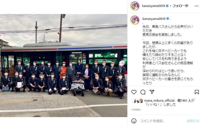 この日の意見交換会は東急バスからの申し出で実施されたと明かした大山さんは「和やかな空気感の中、実際にロールプレイしながら 縁石がある場合、しっかり寄せてもらうか、逆に離してもらって一度車道に下りれたほうが乗せやすくなるというお話や、サポートをしてもらう際、ベビーカーのどの部分を持ってもらえると助かるか、また今一度バス乗車時の手順の確認など、運転士のみなさんやバス会社のみなさんと意見を交換させてもらい、相互理解が深まる素晴らしい時間となりました」と投稿。