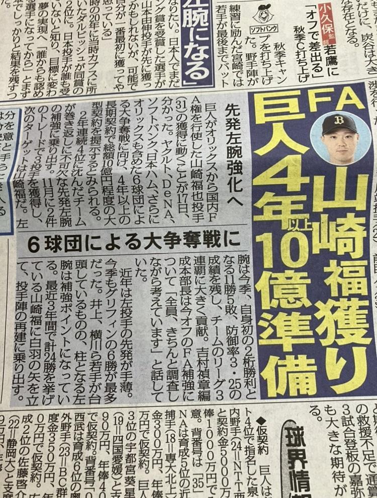 補強ポイントの左の先発投手獲得へ巨人が動く。オリックスからFA宣言した山崎福の複数球団による争奪戦に参戦し、阿部監督が18日の交渉の席に直接出馬することが分かった。新監督自らラブコールを送り、来季のV奪回に不可欠な存在であることを伝える。
