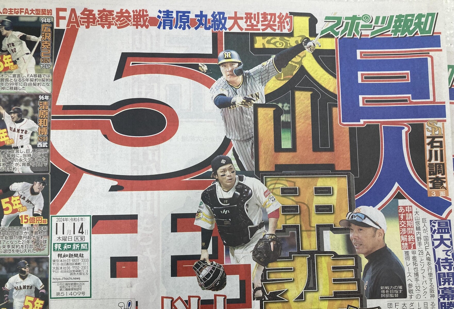 リーグを代表する4番と球界屈指の捕手のダブル獲りに向け、大型契約を用意する見込み。阪神は大山に今季年俸2億8000万円からの大幅増の4年契約、ソフトバンクは甲斐に4年最大12億円の契約を提示しているもよう。巨人はさらに長期の5年以上の複数年契約を準備するとみられる。