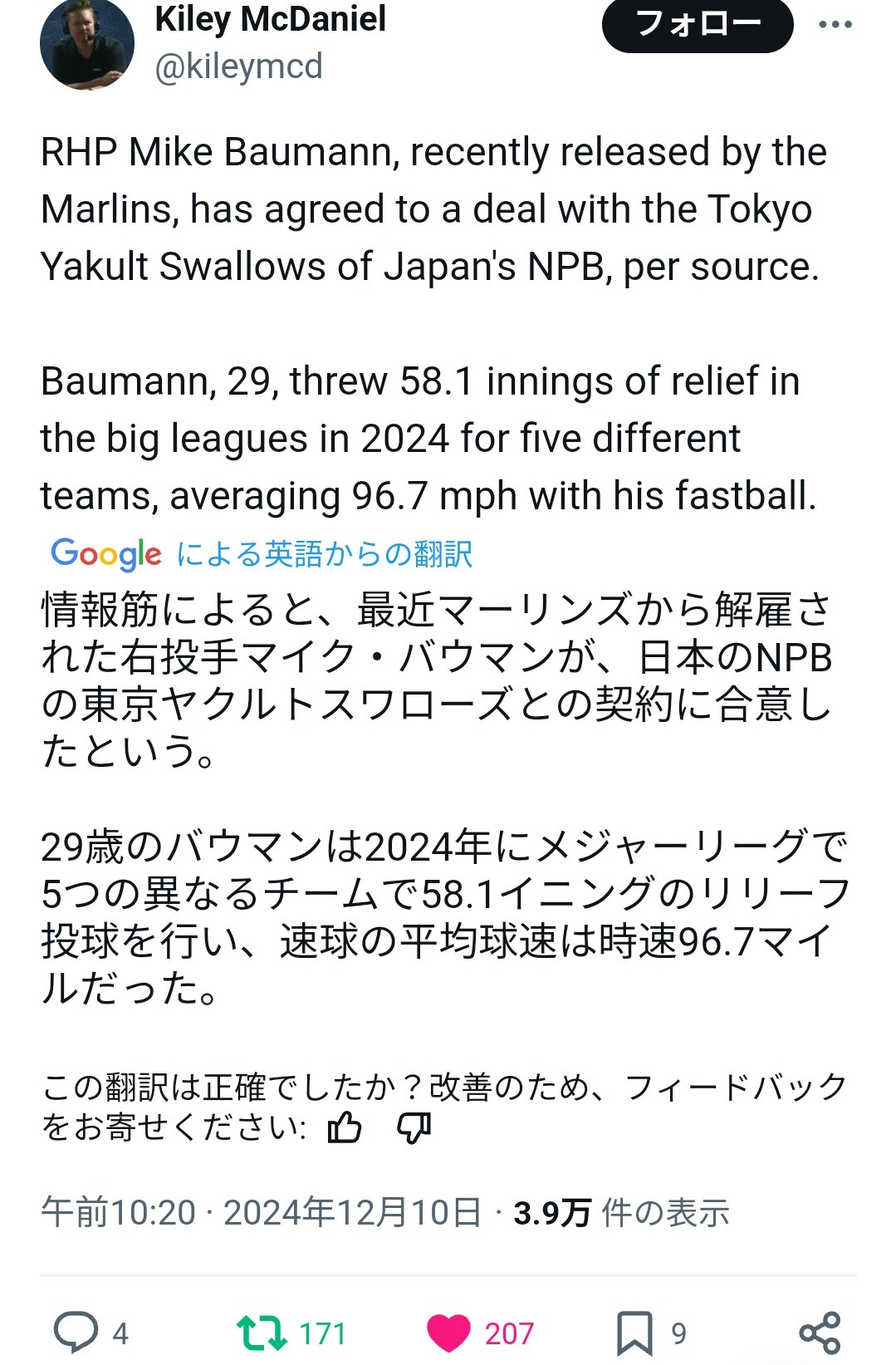 マイケル・バウマン(大谷に50号を打たれた投手)