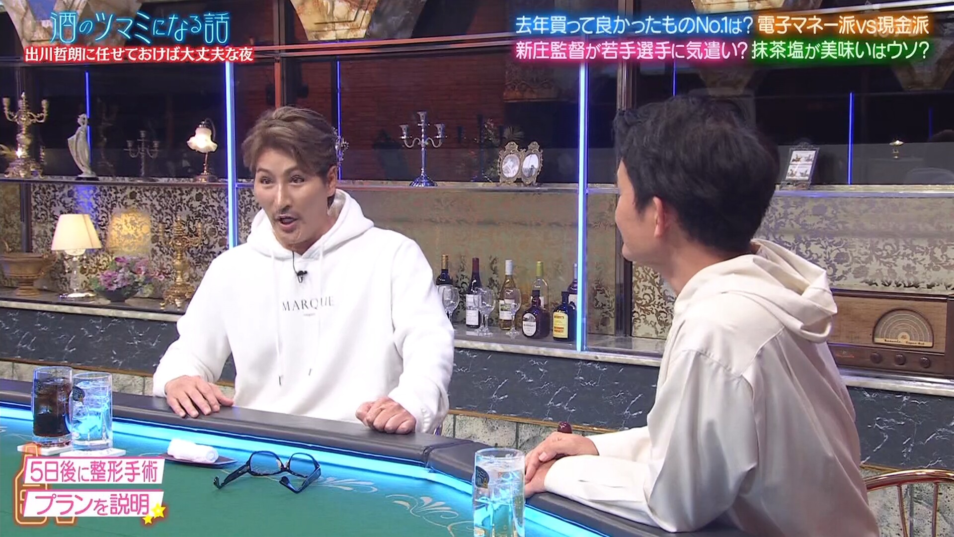 「僕、首のシワが嫌いなんですよ。だからあごの下を切って、ここ(首の皮膚)を伸ばすんですよ。それで(ほおの)脂肪を取って、上にあげて縫うんです」と、話は手術の専門的な部分にも及んだ。