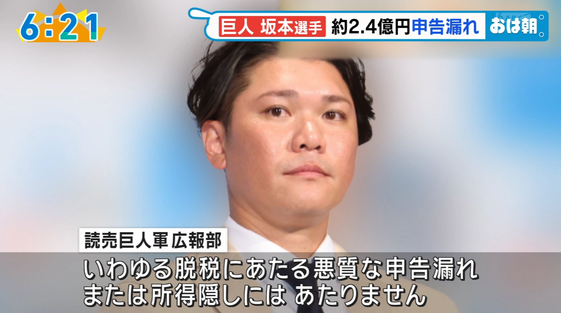 プロ野球・巨人の坂本勇人選手(36)が東京国税局の税務調査を受け、2022年までの3年間で約2億4千万円の申告漏れを指摘されたことが関係者への取材でわかった。