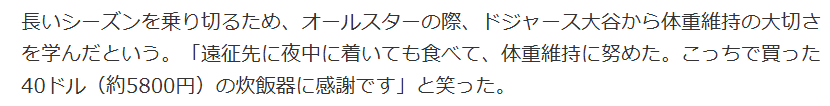 菅野は3月30日(同31日)のブルージェイズ戦でメジャー初登板。4回まで2失点にまとめると、5回の投球練習で異常を訴え、両手のけいれんで緊急降板した。菅野は「トロントのクラブハウスのメシが一番ひどかった(合わなかった)。何も食べないで試合に行ったんですよ、それでつった。米とかないの。この前のカンザスシティー(ロイヤルズ)も、母ちゃんがレンチンのごはんとみそ汁を(持ってきてくれた)。やっぱり日本人は米食べないと力が出ないから」と舞台裏を明かした。