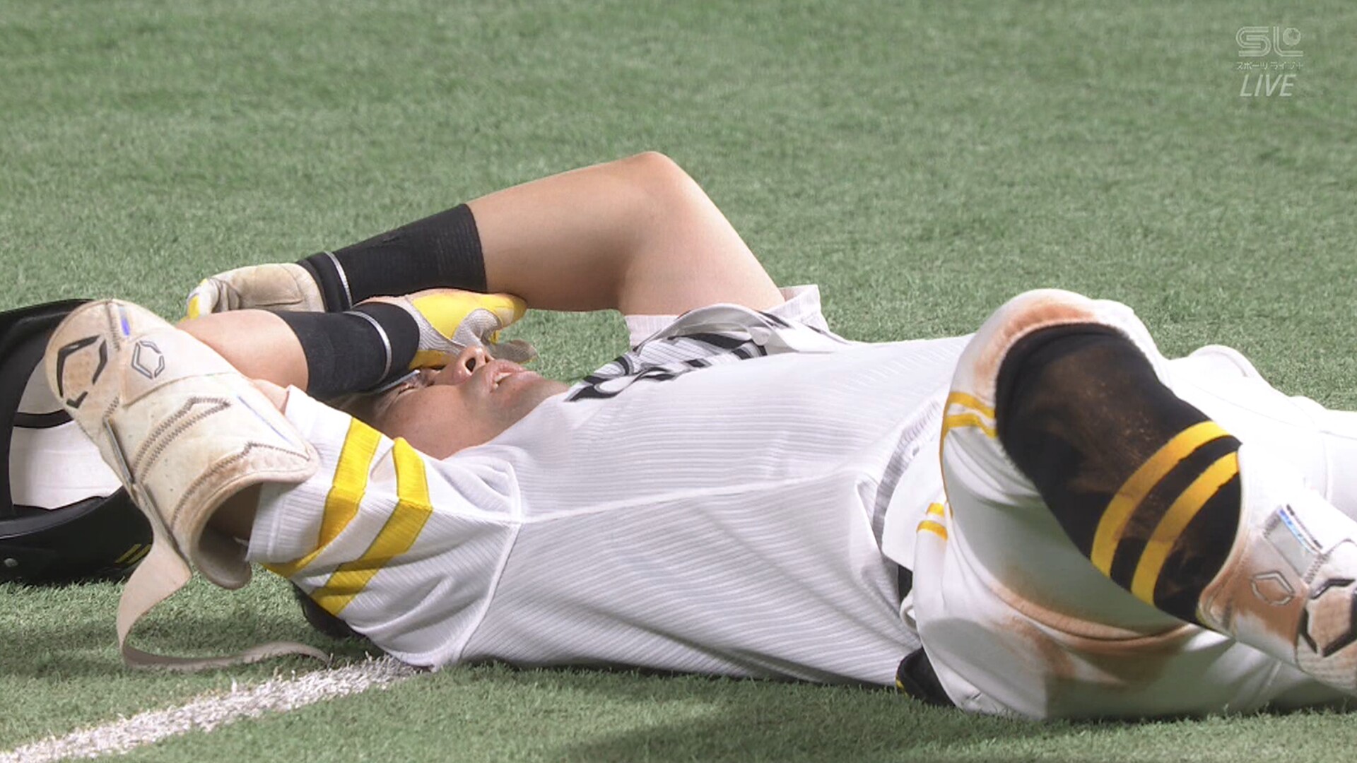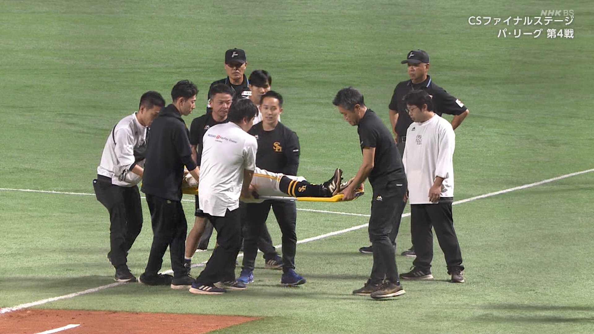 ソフトバンク・中村晃外野手(35)が一塁塁審と激突。担架で搬送されるアクシデントが起きた。