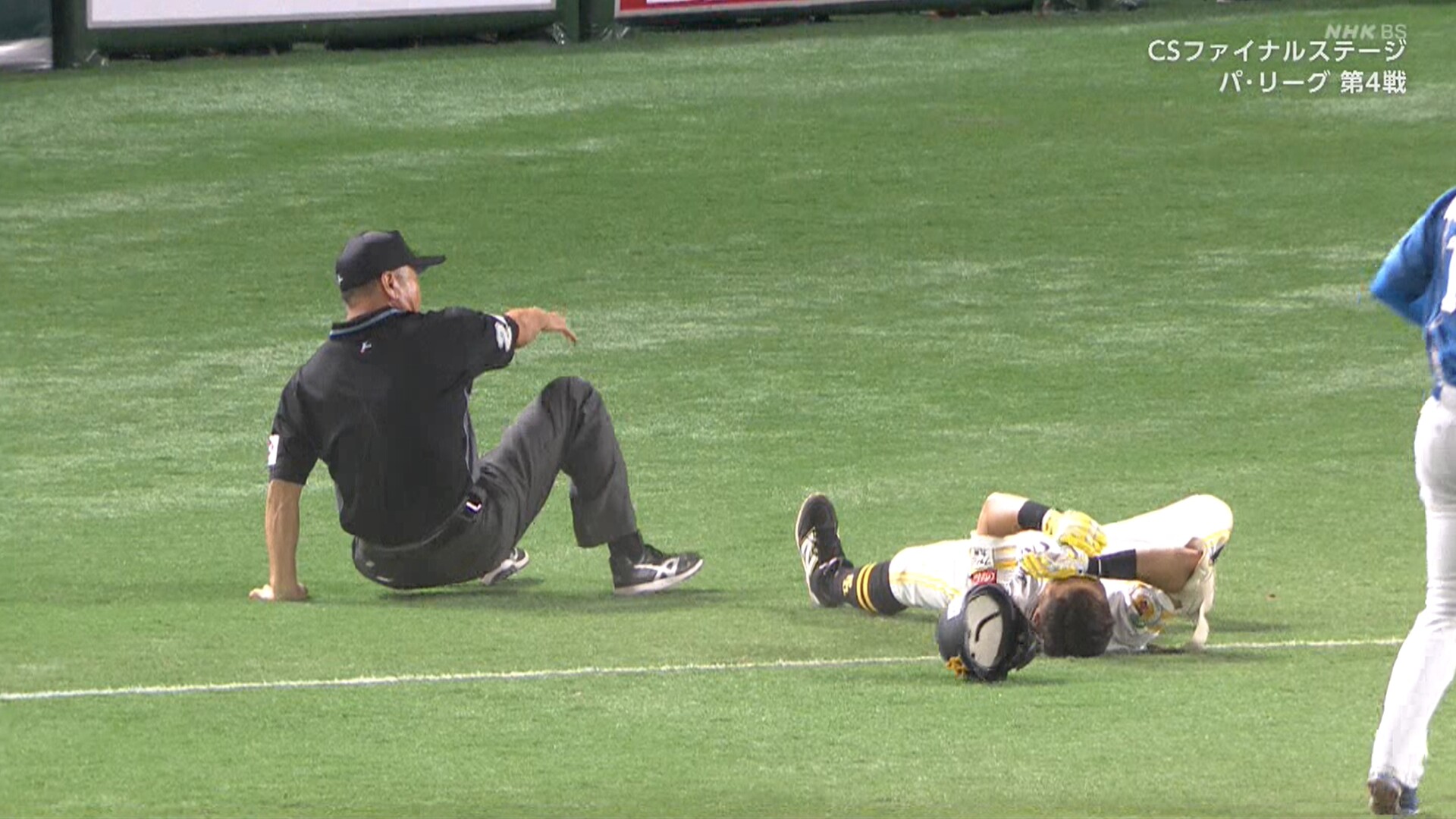 3回の攻撃中。2死一塁の場面で一塁ゴロを放った中村が一塁を駆け抜けたところで、嶋田一塁塁審と正面衝突した。