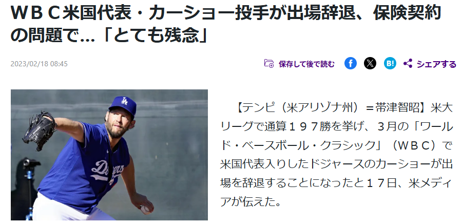 昨季限りで現役を引退した元ドジャースのクレイトン・カーショー投手(37)が3月に行われる第6回ワールド・ベースボール・クラシック(WBC)に米国代表として選出されたことを15日(日本時間16日)、MLB公式サイトが報じた。