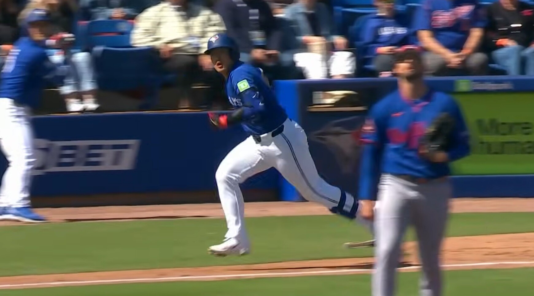 メジャー1年目、ブルージェイズの岡本がオープン戦出場2試合目でうれしい一発。二回一死一塁、1ボール2ストライクから外寄りの変化球を強振すると、打球はグングン伸びてバックスクリーンへ。ゆっくりとダイヤモンドを回り、本塁に達する頃に、うれしそうに表情を緩めた。