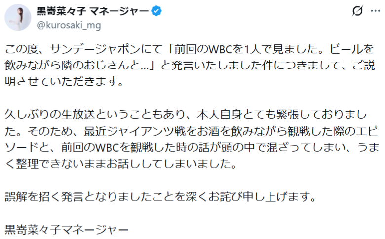 タレントでグラビアアイドルの黒嵜菜々子(22)が3月1日、自身のXを更新。同日に生出演したTBS系『サンデー・ジャポン』での発言について「誤解を招く表現」があったとして謝罪した。