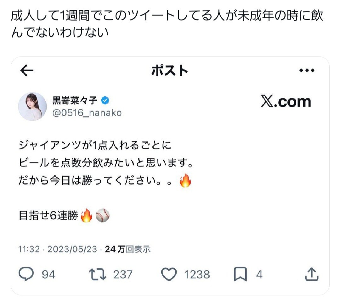 さらに「ビール飲みながら隣のおじさんと『イエー』とやって」と当時の様子を語ったが、この発言を受け、SNS上では「前回のWBCのときまだ二十歳になっていなかったのでは」「3年前ということは未成年飲酒ではないか」といった疑問の声が上がっていた。23年3月当時、黒嵜は19歳だった。