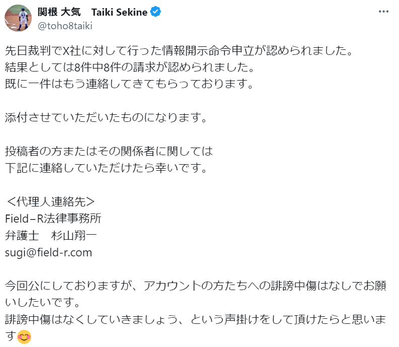 プロ野球・福岡ソフトバンクホークスの上沢直之投手が、Xに投稿された「上沢くたばれ」という投稿が誹謗中傷にあたるとして訴えていた訴訟で、東京地裁は投稿者の発信者情報開示を認めた判決を下した。判決は10月15日付。