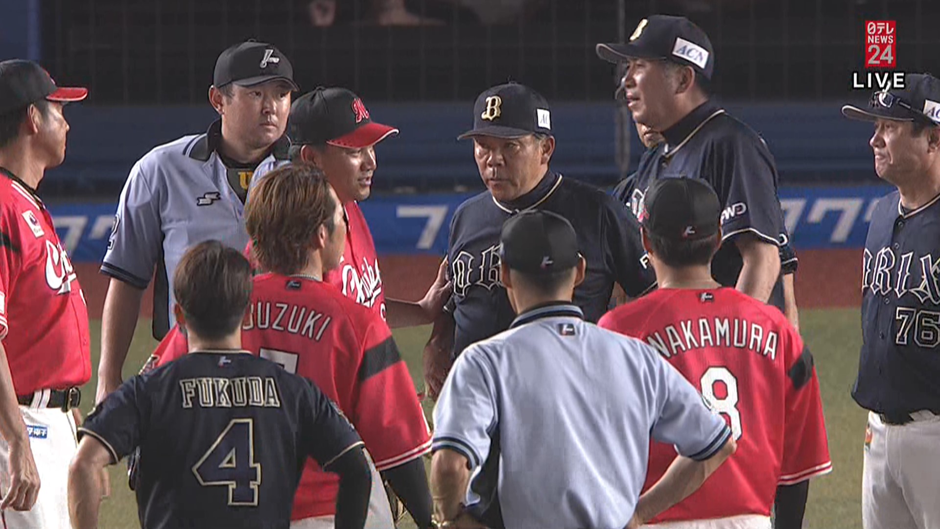 すると両軍ベンチから吉井、中嶋両監督らが出てきて、にらみ合いの様相となったが、乱闘にはいたらず。審判団は警告試合として、試合を再開した。